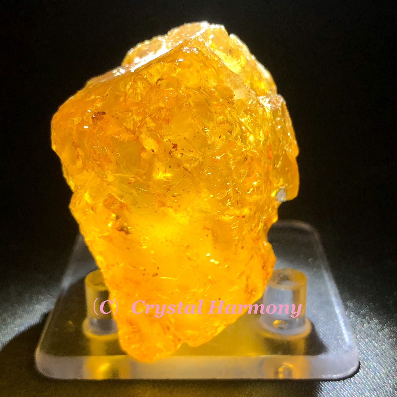 アンバーは鉱物ではなく、今から数千万年からそれ以上前の時代に針葉樹の樹液が地層に埋もれ、長い年月をかけて化石化した樹脂で、熱すると独特の香りを放ち、アラビア語で『竜涎香』を意味する“Anber”に由来しています。